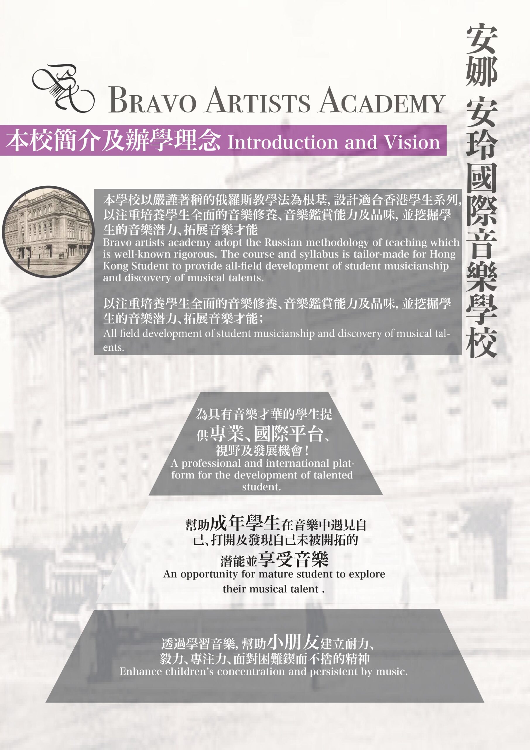 establish music courses for children and adult; host competitions and masterclasses for inter-school competitions and ABRSM exams; A host musical summer camps and international competitions in Hong Kong and abroad; A host international music festivals involving famous musicians; and to invite professors and musicians to conduct masterclasses for students, while bearing the responsibility of developing young music teachers, so to inherit the systematic Russian school of piano tuition.